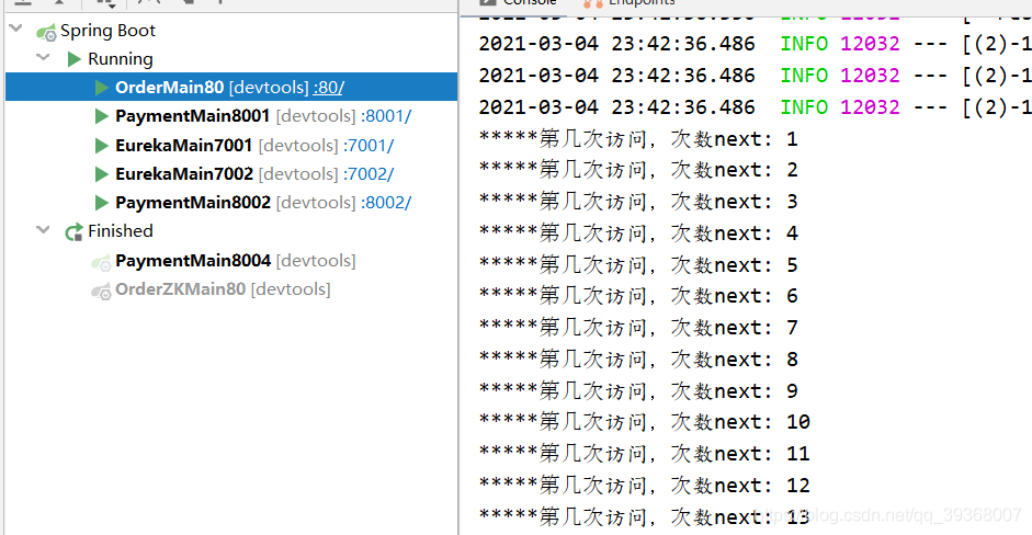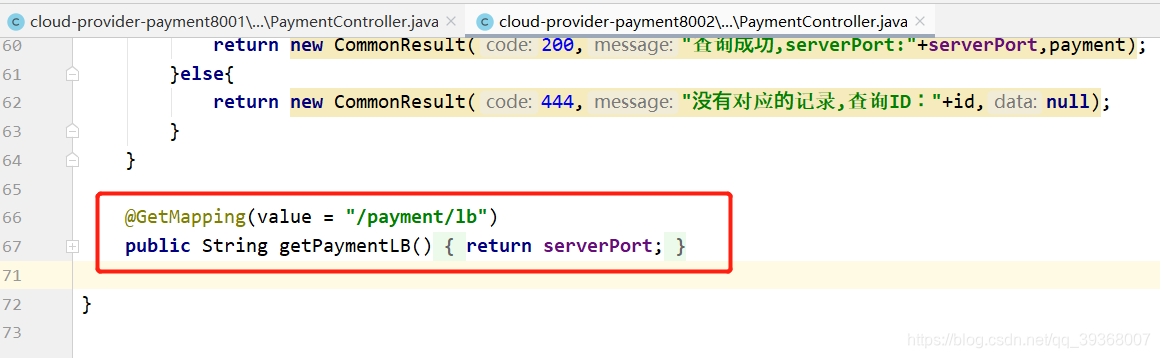 package com.dym.springcloud.lb;import org.springframework.cloud.client.ServiceInstance;import java.util.List;public interface LoadBalancer{ ServiceInstance instances(List serviceInstances);} package com.dym.springcloud.lb;import org.springframework.cloud.client.ServiceInstance;import org.springframework.stereotype.Component;import java.util.List;import java.util.concurrent.atomic.AtomicInteger;@Componentpublic class MyLB implements LoadBalancer{ private AtomicInteger atomicInteger = new AtomicInteger(0); public final int getAndIncrement() { int current; int next; do { current = this.atomicInteger.get(); next = current >= 2147483647 ? 0 : current + 1; }while(!this.atomicInteger.compareAndSet(current,next)); System.out.println("*****第几次访问,次数next: "+next); return next; } //负载均衡算法:rest接口第几次请求数 % 服务器集群总数量 = 实际调用服务器位置下标 ,每次服务重启动后rest接口计数从1开始。 @Override public ServiceInstance instances(List serviceInstances) { int index = getAndIncrement() % serviceInstances.size(); return serviceInstances.get(index); }} package com.dym.springcloud.controller;import com.dym.springcloud.entities.CommonResult;import com.dym.springcloud.entities.Payment;import com.dym.springcloud.lb.LoadBalancer;import lombok.extern.slf4j.Slf4j;import org.springframework.cloud.client.ServiceInstance;import org.springframework.cloud.client.discovery.DiscoveryClient;import org.springframework.http.ResponseEntity;import org.springframework.web.bind.annotation.GetMapping;import org.springframework.web.bind.annotation.PathVariable;import org.springframework.web.bind.annotation.RestController;import org.springframework.web.client.RestTemplate;import javax.annotation.Resource;import java.net.URI;import java.util.List;@RestController@Slf4jpublic class OrderController{ //public static final String PAYMENT_URL = "http://localhost:8001"; public static final String PAYMENT_URL = "http://CLOUD-PAYMENT-SERVICE"; @Resource private RestTemplate restTemplate; @Resource private LoadBalancer loadBalancer; @Resource private DiscoveryClient discoveryClient; @GetMapping("/consumer/payment/create") public CommonResult create(Payment payment) { return restTemplate.postForObject(PAYMENT_URL +"/payment/create",payment,CommonResult.class); } @GetMapping("/consumer/payment/get/{id}") public CommonResult getPayment(@PathVariable("id") Long id) { return restTemplate.getForObject(PAYMENT_URL+"/payment/get/"+id,CommonResult.class); } @GetMapping("/consumer/payment/getForEntity/{id}") public CommonResult getPayment2(@PathVariable("id") Long id) { ResponseEntity entity = restTemplate.getForEntity(PAYMENT_URL+"/payment/get/"+id,CommonResult.class); if(entity.getStatusCode().is2xxSuccessful()){ return entity.getBody(); }else{ return new CommonResult<>(444,"操作失败"); } } @GetMapping(value = "/consumer/payment/lb") public String getPaymentLB() { List instances = discoveryClient.getInstances("CLOUD-PAYMENT-SERVICE"); if(instances == null || instances.size() <= 0) { return null; } ServiceInstance serviceInstance = loadBalancer.instances(instances); URI uri = serviceInstance.getUri(); return restTemplate.getForObject(uri+"/payment/lb",String.class); }}